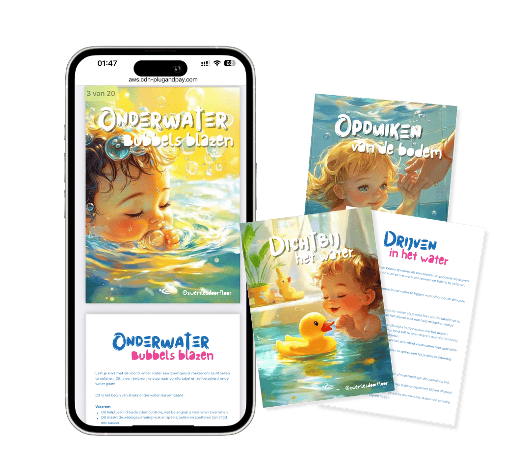 De exacte roadmap om je kind in ZELF de basis van het zwemmen te geven en zichzelf kunnen redden zónder bandjes.