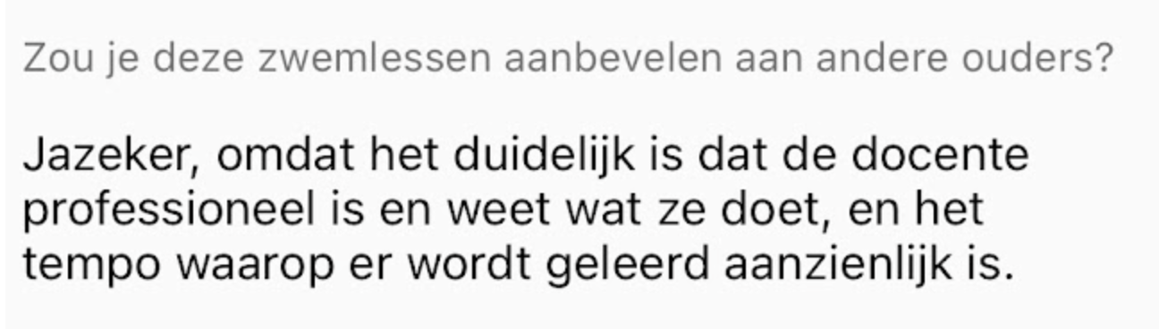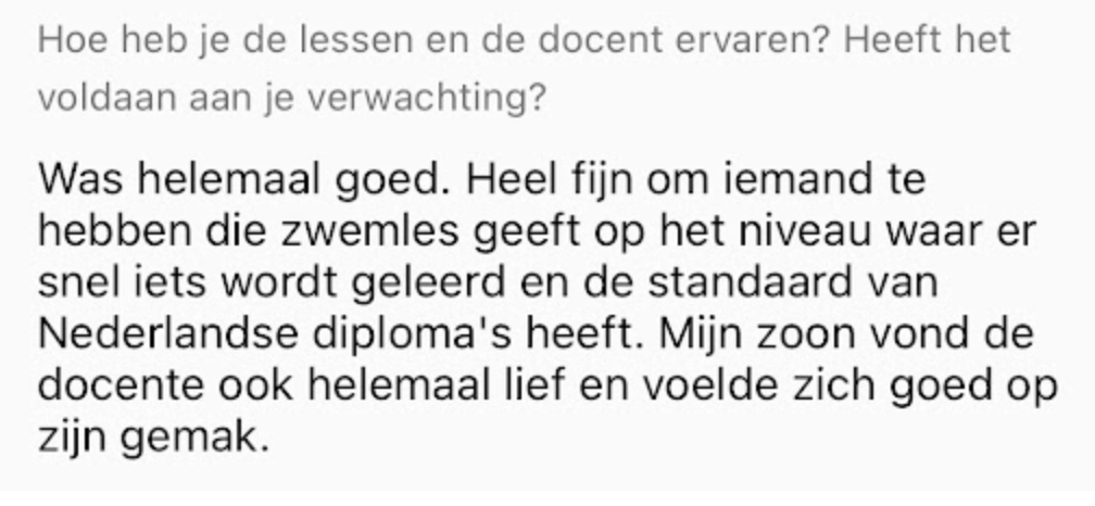 We spreken vooraf duidelijke en haalbare verwachtingen af. Geen loze beloftes, geen “we zien wel of je kind kan afzwemmen" Maar een plan dat past bij jouw kind.