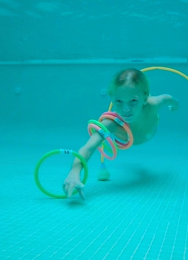 Onderwater-Oriëntatie: De ogen blijven open. Je kind begrijpt waar het is en raakt niet gedesoriënteerd als het kopje onder gaat.
