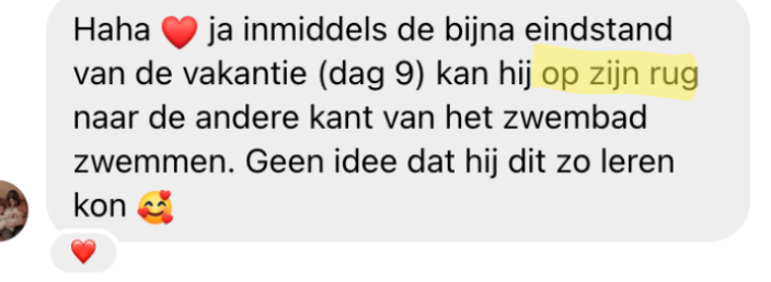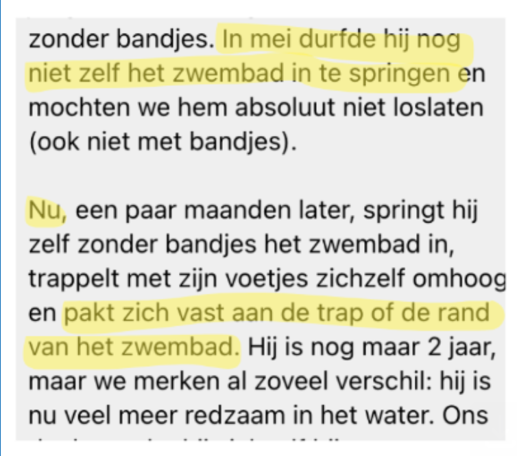 Hier komt alles samen wat je hebt opgebouwd. Je krijgt van mij de blauwdruk "Klaar voor zwemles". Wat je hier leert, zijn letterlijk de eerste 6-8 maanden die normaal gesproken in de eerste badjes bij de zwemschool wordt geleerd. Jij leert dit in de factie van de tijd (zichtbaar resultaat in 2 maanden!) en de kosten.